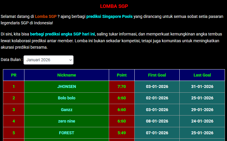 Di sini, kita bisa berbagi prediksi angka SGP hari ini, saling tukar informasi, dan memperkuat kemungkinan angka tembus lewat kolaborasi prediksi antar member. Lomba ini bukan sekadar kompetisi, tetapi juga komunitas untuk meningkatkan akurasi prediksi bersama.